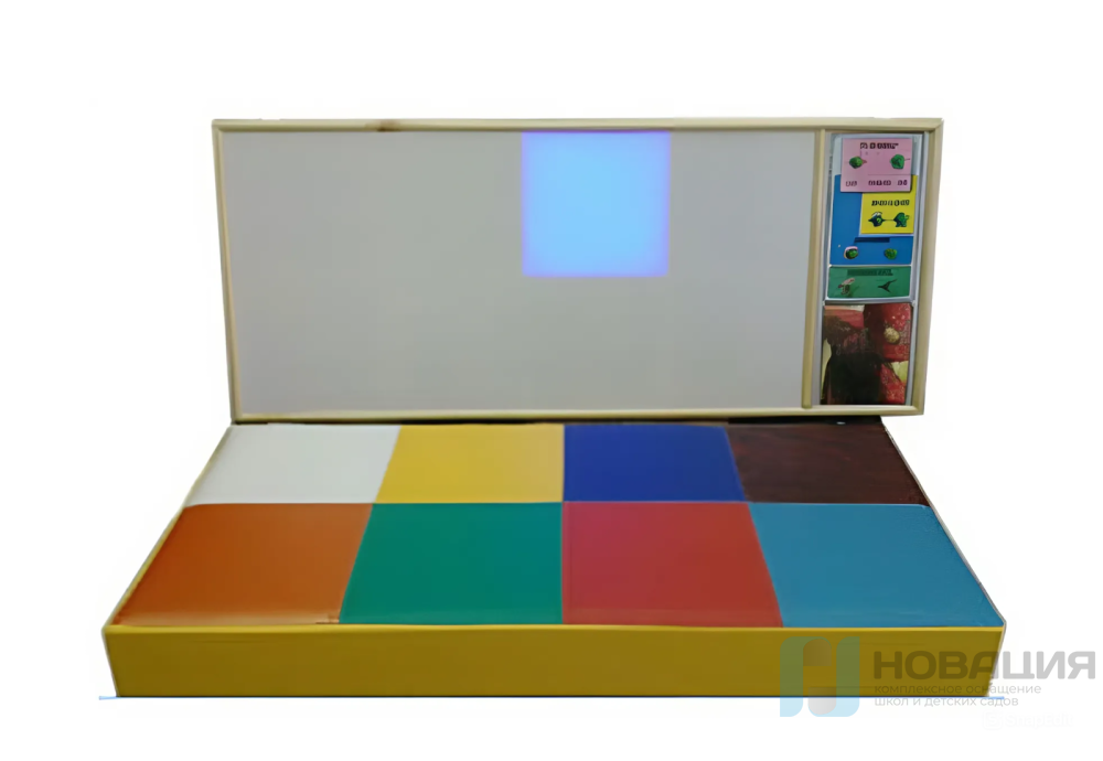 Панель представляет собой комплект, состоящий из светового экрана с цветными ячейками и напольной платформы с цветными мягкими квадратами. Блок управления расположен в световом экране. Панель предназначена для развития навыков различения цветов, музыкальных нот, игры. Идеальна для сенсорной комнаты.