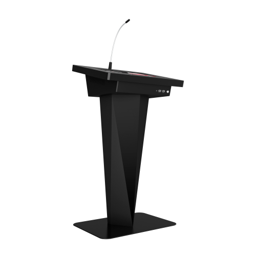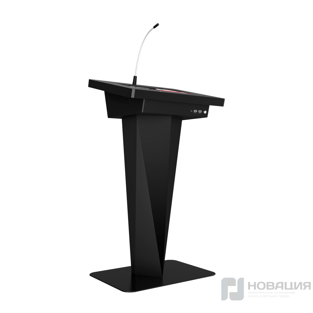 Трибуна оснащена двумя микрофонами и сенсорным дисплеем. Имеет все необходимые разъемы для подключения техники.