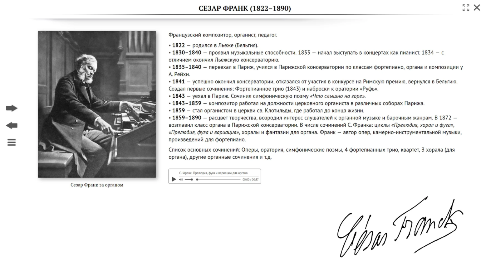 Электронное пособие дополняет собой музыкальную литературу, подходит для самостоятельной работы. Тематические главы содержат аудио- и видеофайлы, тексты, ноты, иллюстрации. Каждый раздел сопровождается заданиями, вопросами для викторины, тестами.