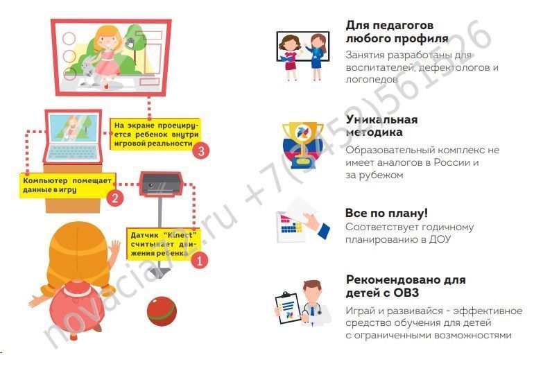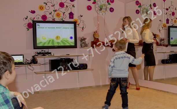 - Далее выбирается развивающее мультимедийное занятие, датчик Kinect определяет движения ребенка и передает данные в компьютер (или сенсорный экран), таким образом, дети могут управлять объектами игры на расстоянии.
