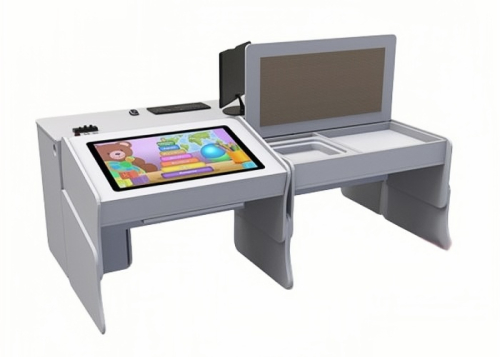 Психолог размещается за отдельным рабочим столом с монитором, дублирующим действия ребенка. Дополнительно имеется модуль с зеркалом для работы по артикуляции и коррекции речи.
