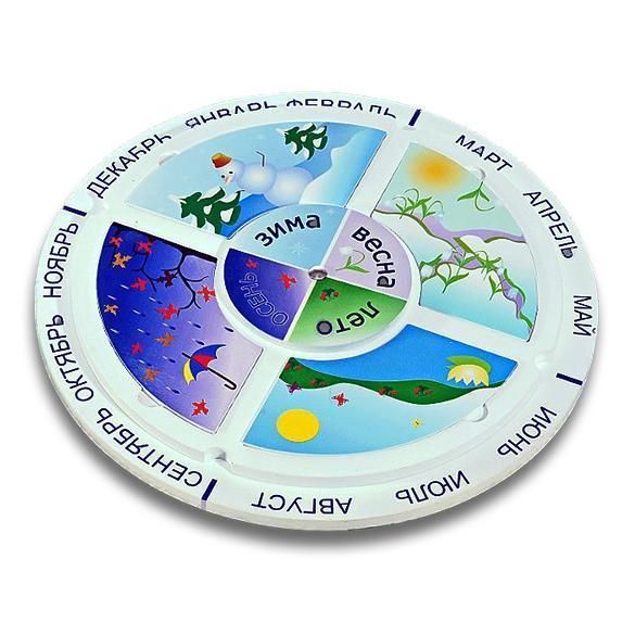 Календарь для знакомства с окружающей средой состоит из 3-х дисков. На первом и третьем названия времен года и месяцев, на втором изображения погодных условий. Ребенок вращает круглые элементы, подбирая к картинкам соответствующие слова.