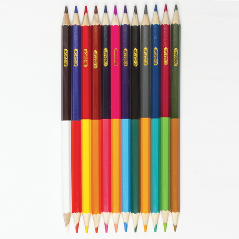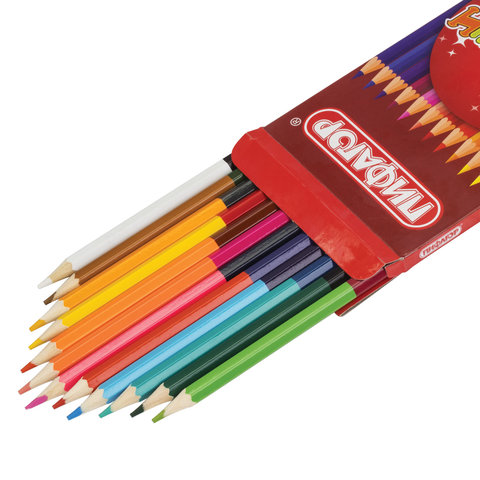 Набор состоит из 12 карандашей и 24 цветов: черный-белый, синий-красный, алый-желтый, бордовый-оранжевый, розовый-темно-синий, фуксия-канареечный, голубой-фиолетовый, зеленый-коричневый, персиковый-серый, бирюзовый-синий, салатовый-пурпурный, коричневый-темно-зеленый. Шестигранная форма сечения корпуса позволяет не скатываться карандашу с поверхности стола во время занятий рисованием. Они изготовлены из высокосортной белой древесины ценных пород и имеют лакированный корпус. Качество древесины и исполнения гарантируют легкую заточку. Грифель из натуральных материалов и пигментов диаметром 3 мм обладает повышенной прочностью. Все карандаши заточены с двух сторон и поставляются в картонной упаковке с европодвесом.