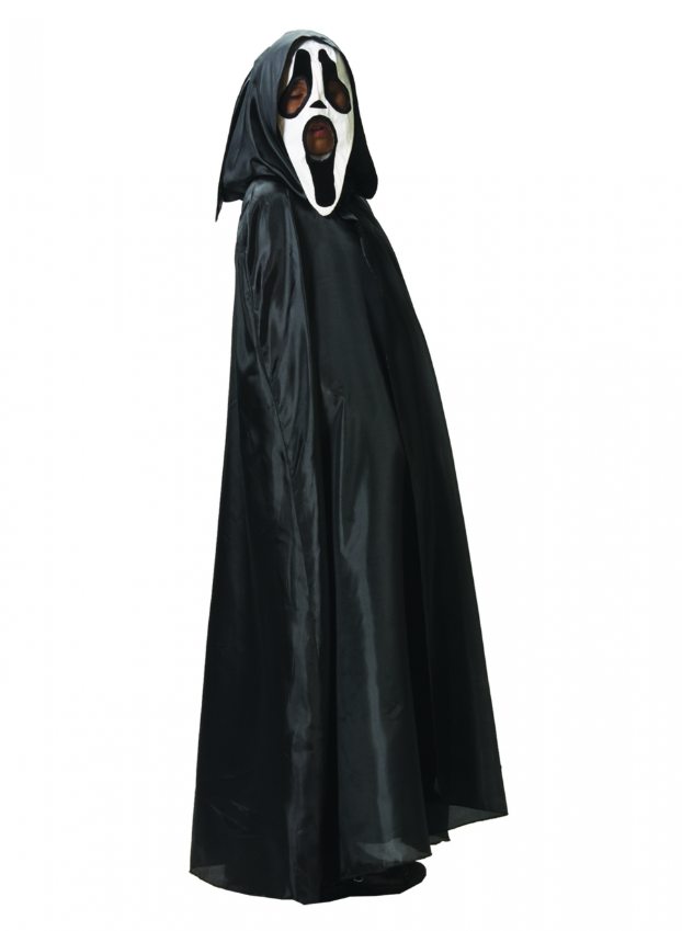 Ужасающий наряд включает в себя удлиненный плащ-балахон с капюшоном из тафетты, и маску из хлопчатобумажного материала с прорезями для глаз и рта. Прорези для глаз и рта в маске скрыты черным тонким фатином, благодаря ему в костюме не жарко и легко дышать.