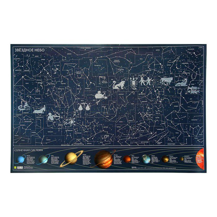 Карта с европодвесом размещается на стене в школе. Пособие подходит для кабинета астрономии, рассказывает о небесных телах и устройстве Галактики. На темном поле изображаются очертания созвездий с подписями. Созвездия светятся в темноте. В нижней части карты изображены планеты с названиями, приводится краткая информация.