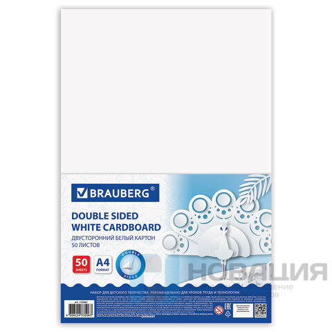 Картон белый А4 МЕЛОВАННЫЙ (белый оборот), 50 листов, в пленке, BRAUBERG, 210х297 мм, 113562