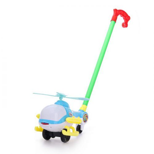 Детская игрушка в виде вертолета оснащена 2-колесами, пропеллером и рукояткой с крючком. Каталка не имеет острых углов, приводится в движение механически.