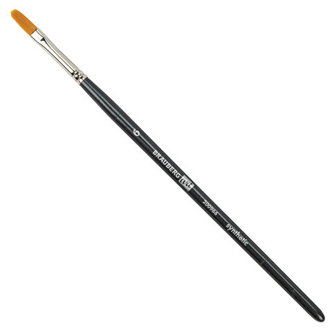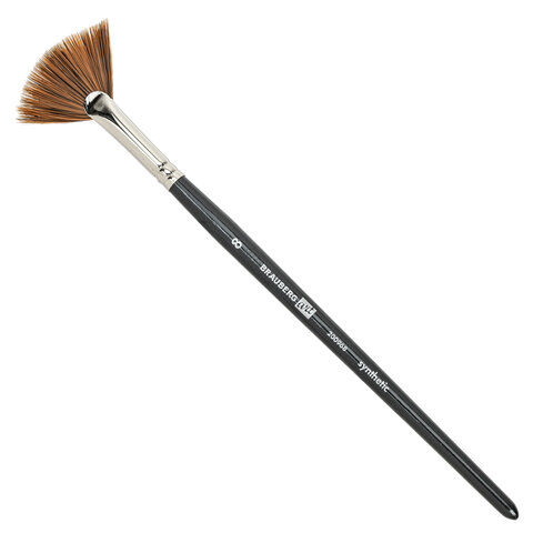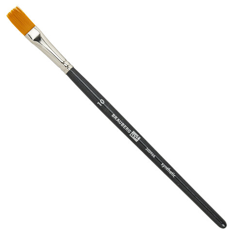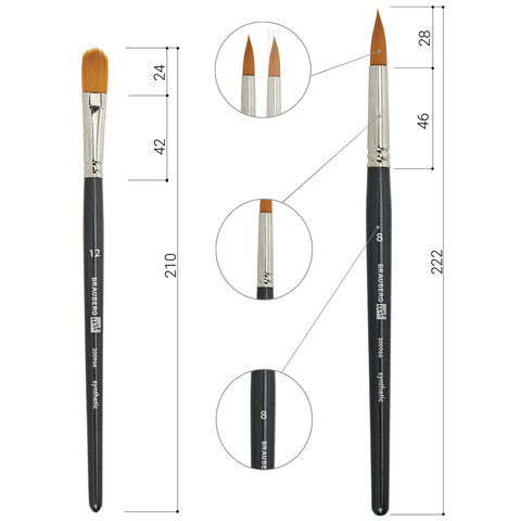 Кисти изготовлены с применением синтетики. Отличаются универсальностью в использовании, обусловленной упругостью ворса и прекрасными впитывающими свойствами пучка. Короткая ручка из древесины покрыта лаком, что защищает ее от воздействия красок и влаги. Форма пучка - круглая № 0, 1, 3, 5, 8; плоская № 6, 10, 12; скошенная № 14; овальная № 6, 12; веерная № 8. Номер кисти соответствует реальной ширине пучка в миллиметрах. Упаковка - текстильный пенал в ОПП-пакете.