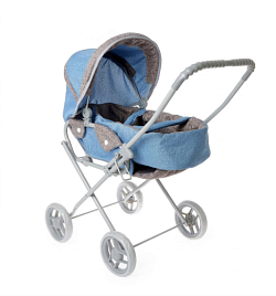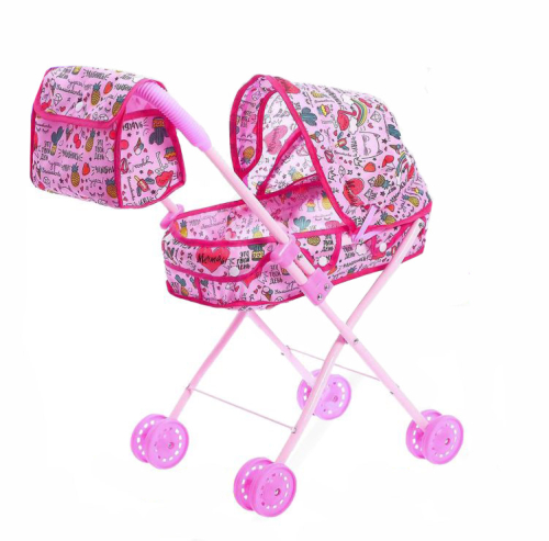Складная коляска рассчитана на кукол. Крестообразные опоры оснащены 4-мя колесами. Для перемещения предусмотрена дугообразная ручка. Люлька с цветным тканевым чехлом дополнена козырьком.