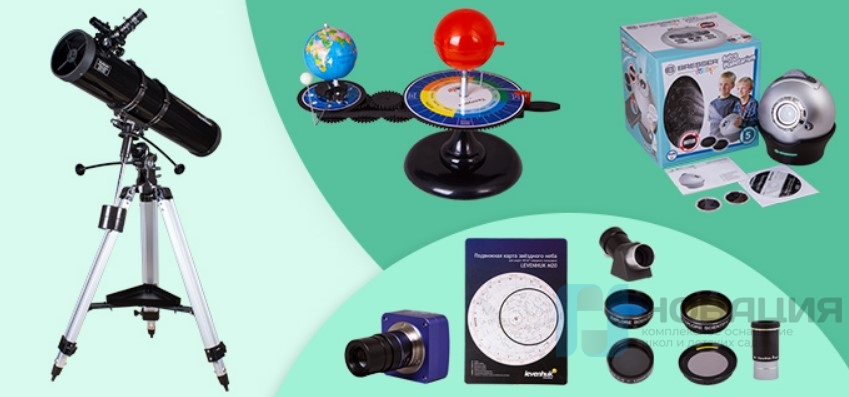 Оборудование для изучения астрономии сочетает в себе оптическую технику и наглядные пособия.