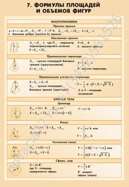 - Формулы площадей и объемов фигур;