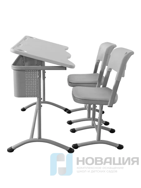 Каркас стола и стула усилен поперечинами, предназначенными для удобства расположения ног. Концы опор защищены специальными заглушками, предотвращающими повреждение напольного покрытия. Углы всех элементов сглажены, что обеспечивает безопасность в школьном классе.