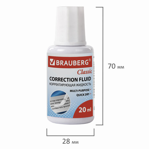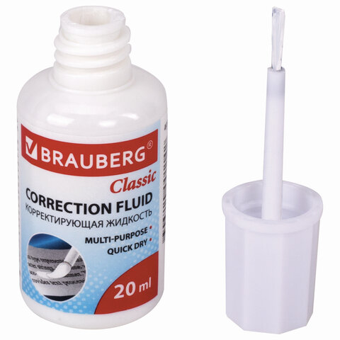 Корректирующая жидкость BRAUBERG "Classic", быстросохнущая, 20 мл, с кисточкой, 220255
