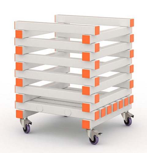 Передвижная корзина на 4-х колесах состоит из ПВХ-труб прямоугольного сечения. Каркас не меняет форму даже при размещении внутри влажного детского инвентаря.