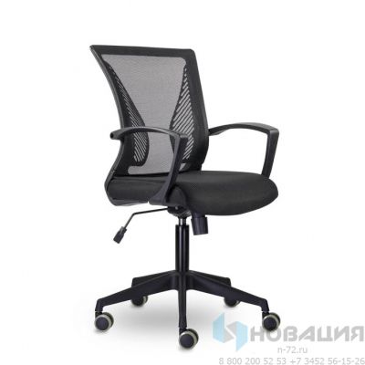 Мебель дополняется подлокотниками из пластика, спинка обтянута сеткой, сиденье оформляется тканью-сеткой. Высота кресла изменяется, пятилучье (d=640 мм) оборудуется роликами с покрытием из полиуретана.
