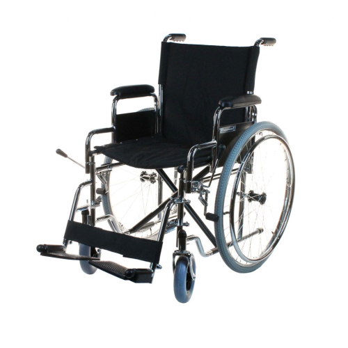 Инвалидная коляска с прочной стальной рамой, покрытая хромом, легко складывается и обладает всеми необходимыми функциями для комфортного пересаживания.