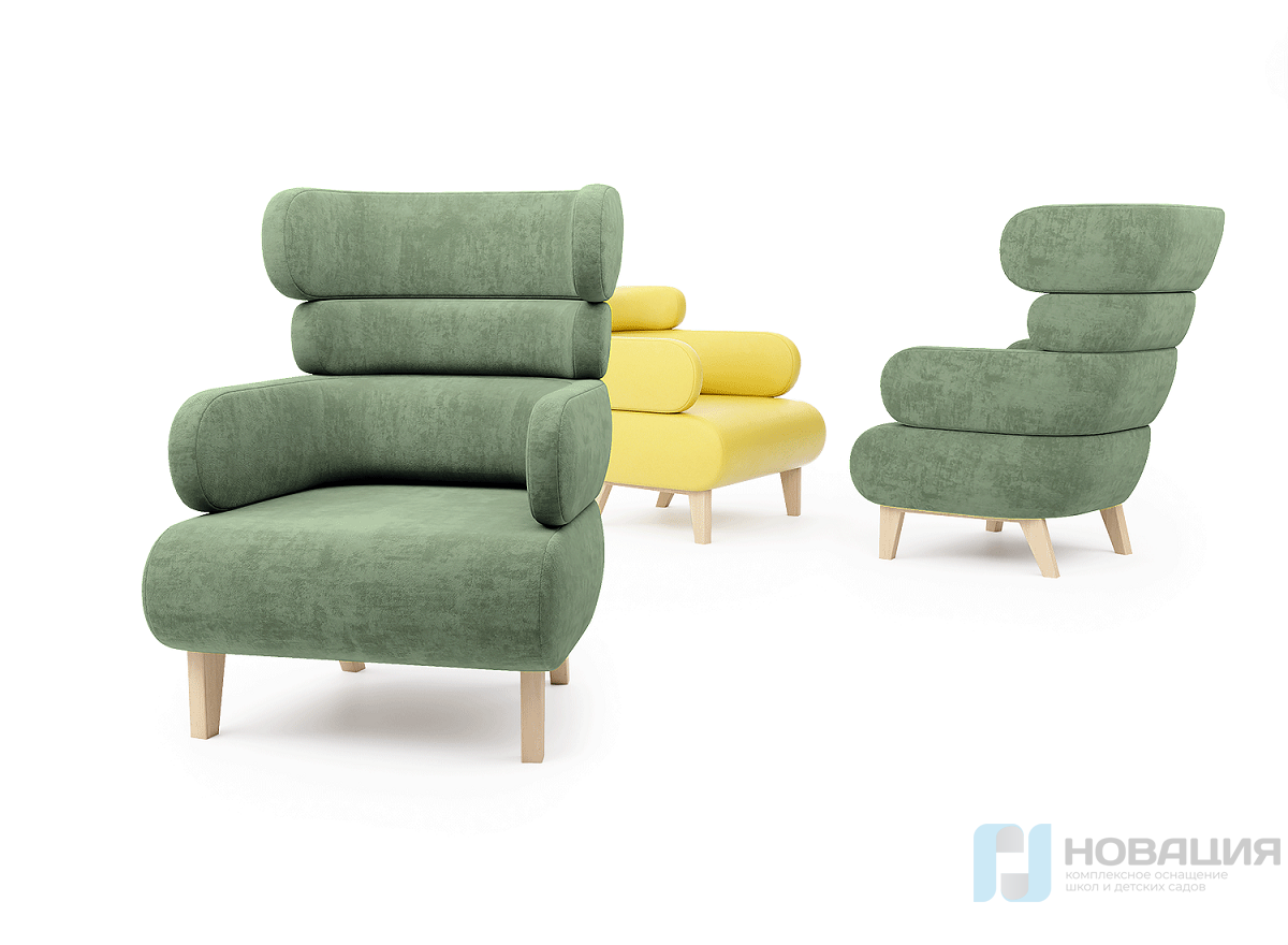 Кресло оснащено подлокотниками и эргономичной спинкой из нескольких секций. Размещается на четырех опорах.