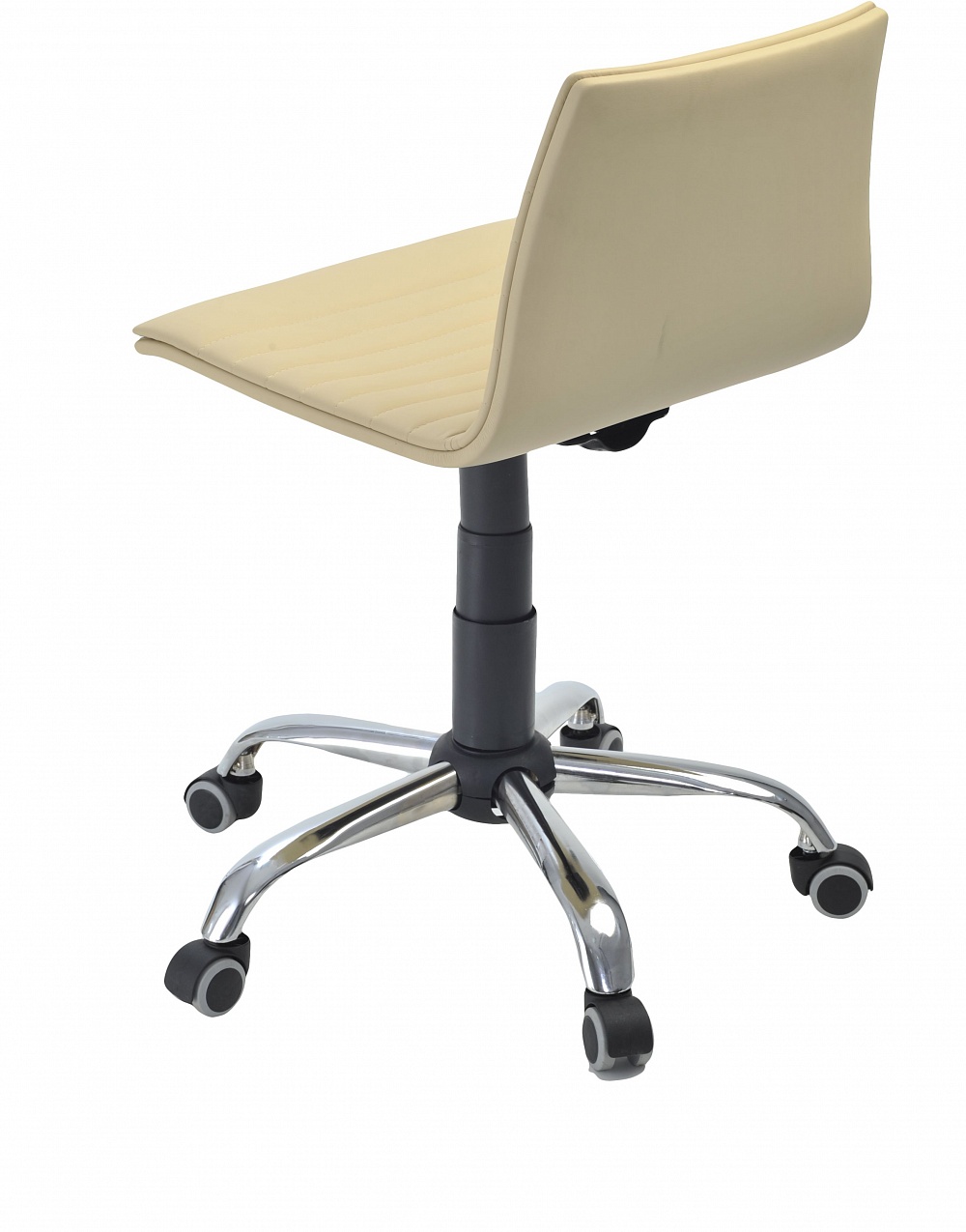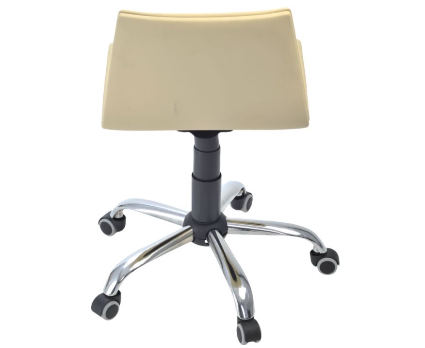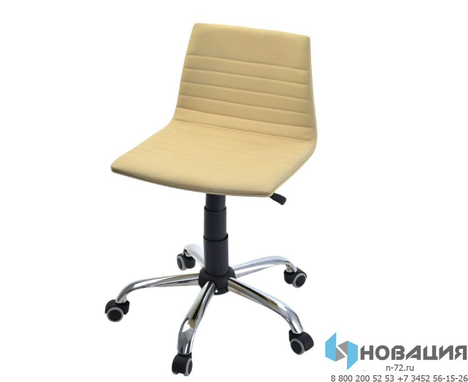 Кресло с мягким ложе регулируется по высоте и силе качания. Хромированное пятилучье стоит на колесах. Сиденье переходит в невысокую спинку без подлокотников. Ограничение по вертикальной нагрузке составляет 120 кг.