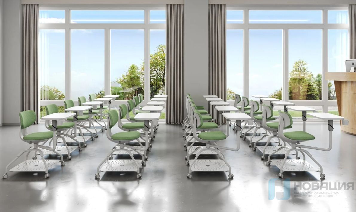 Универсальное кресло с мягкой спинкой и сиденьем, со встроенным пюпитром и вместительной нижней полкой предназначено для образовательных учреждений и аудиторий.