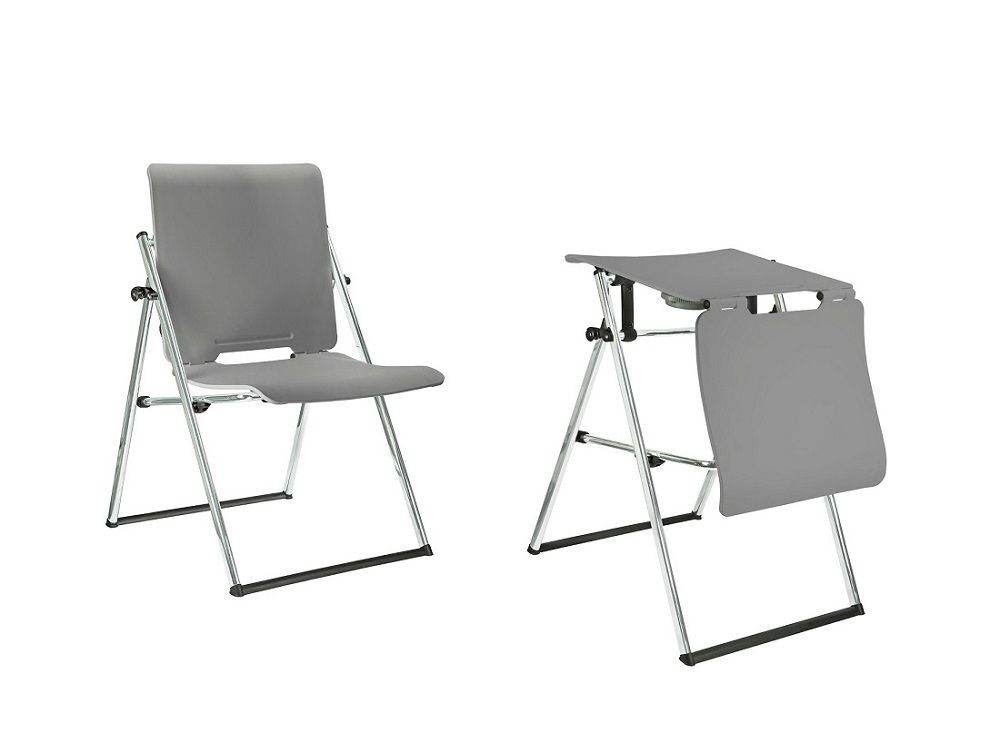 Мебель-трансформер выдерживает 120 кг. Рама из хромированного металла раскладывается. Изделие превращается в стул (сиденье 490х420 мм, спинка 610х470 мм) или выполняет функцию стола (рабочая поверхность 490х470 мм, высота над полом 750 мм). Расстояние между скрещенными опорами 680 мм. Конструкция стоит на 2-х полозьях, укреплена перекладинами.