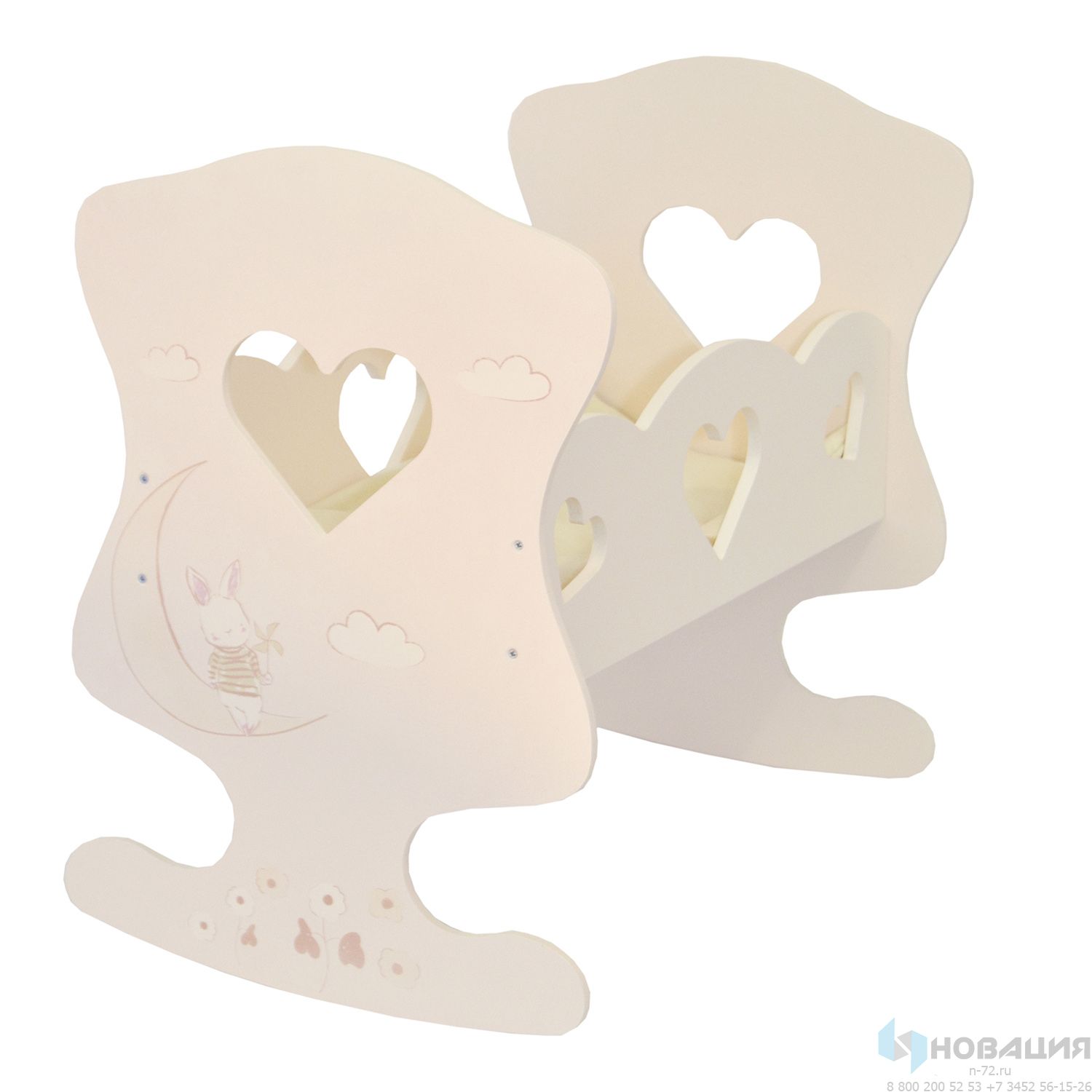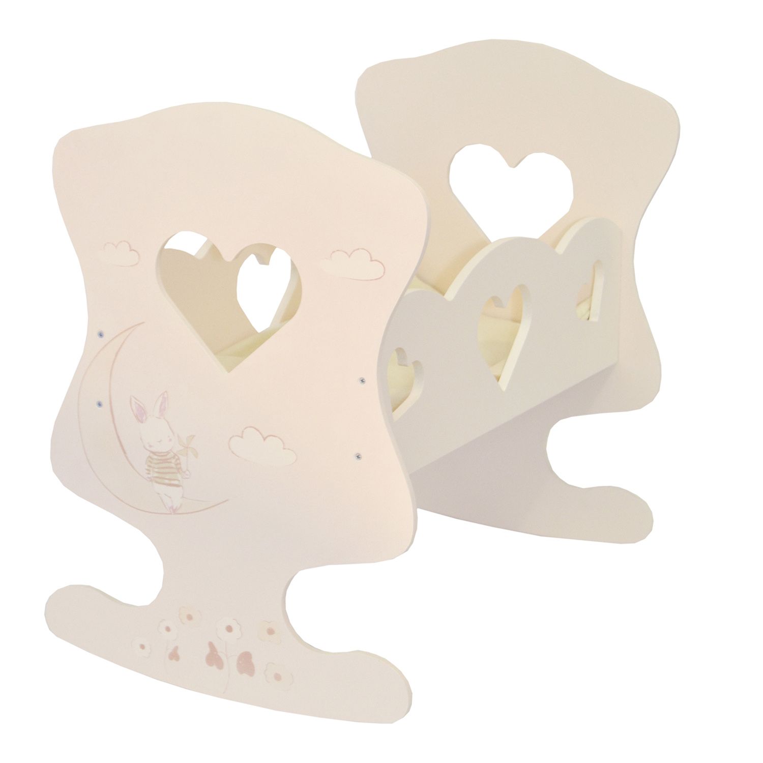 Поставляется в разобранном виде с инструкцией по сборке. В комплект также входят подушка, матрас и одеяло. Кроватка подойдёт для игр с куклами до 45 сантиметров. Бортики декорированы фигурными вырубками в форме сердец и рисунком.