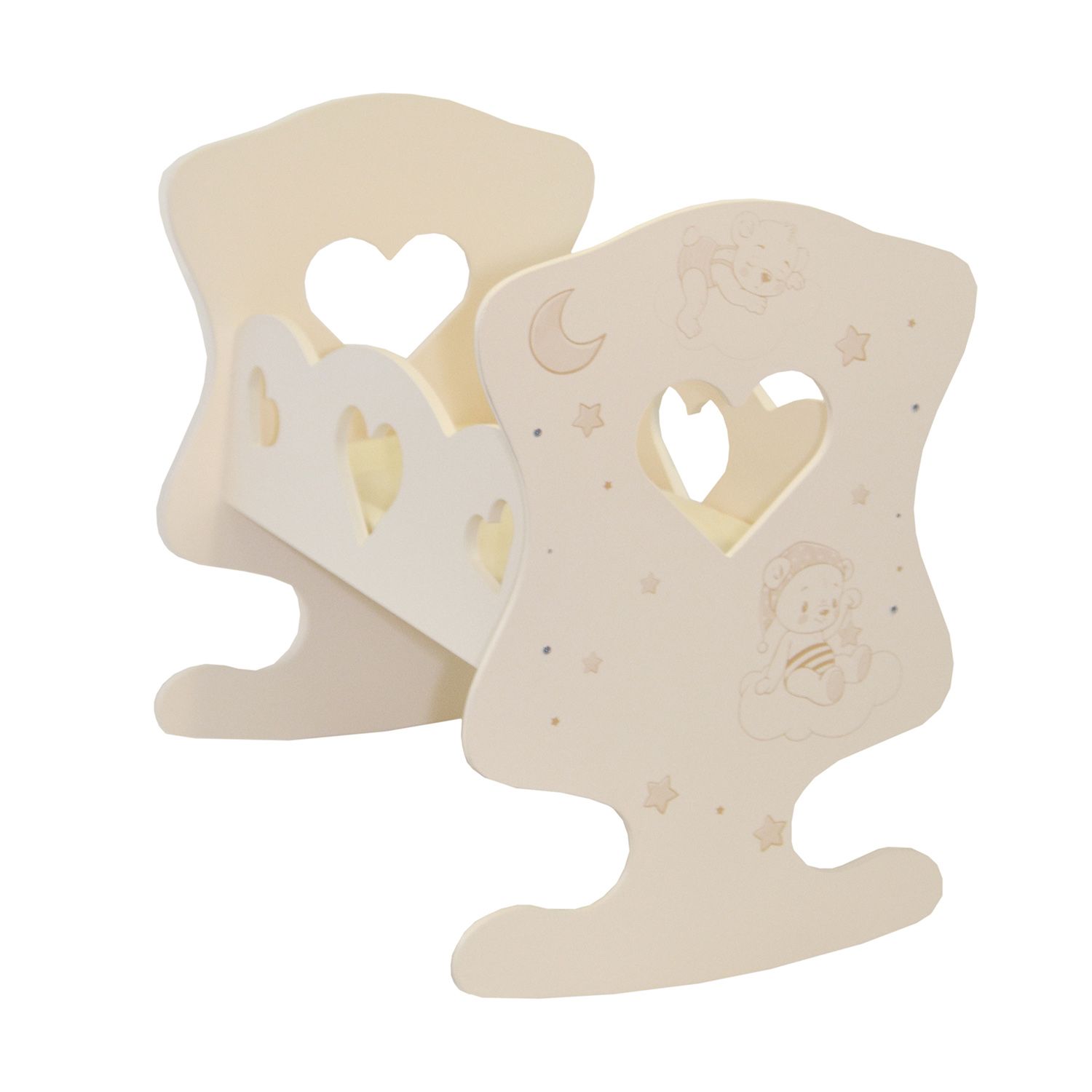 Кроватка поставляется в разобранном виде с инструкцией по сборке. В комплект входит постельное бельё: подушка, матрас, одеяло. Корпус люльки украшен фигурными вырубками в форме сердец и рисунком. Подходит для кукол высотой не более 30 сантиметров.