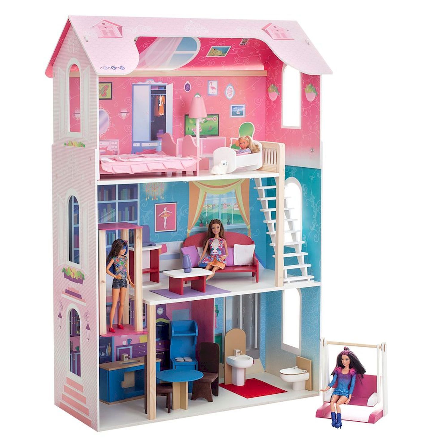 В комплект входят кукольный домик и 17 предметов мебели и аксессуаров: качели, раковина, кровать и пр..