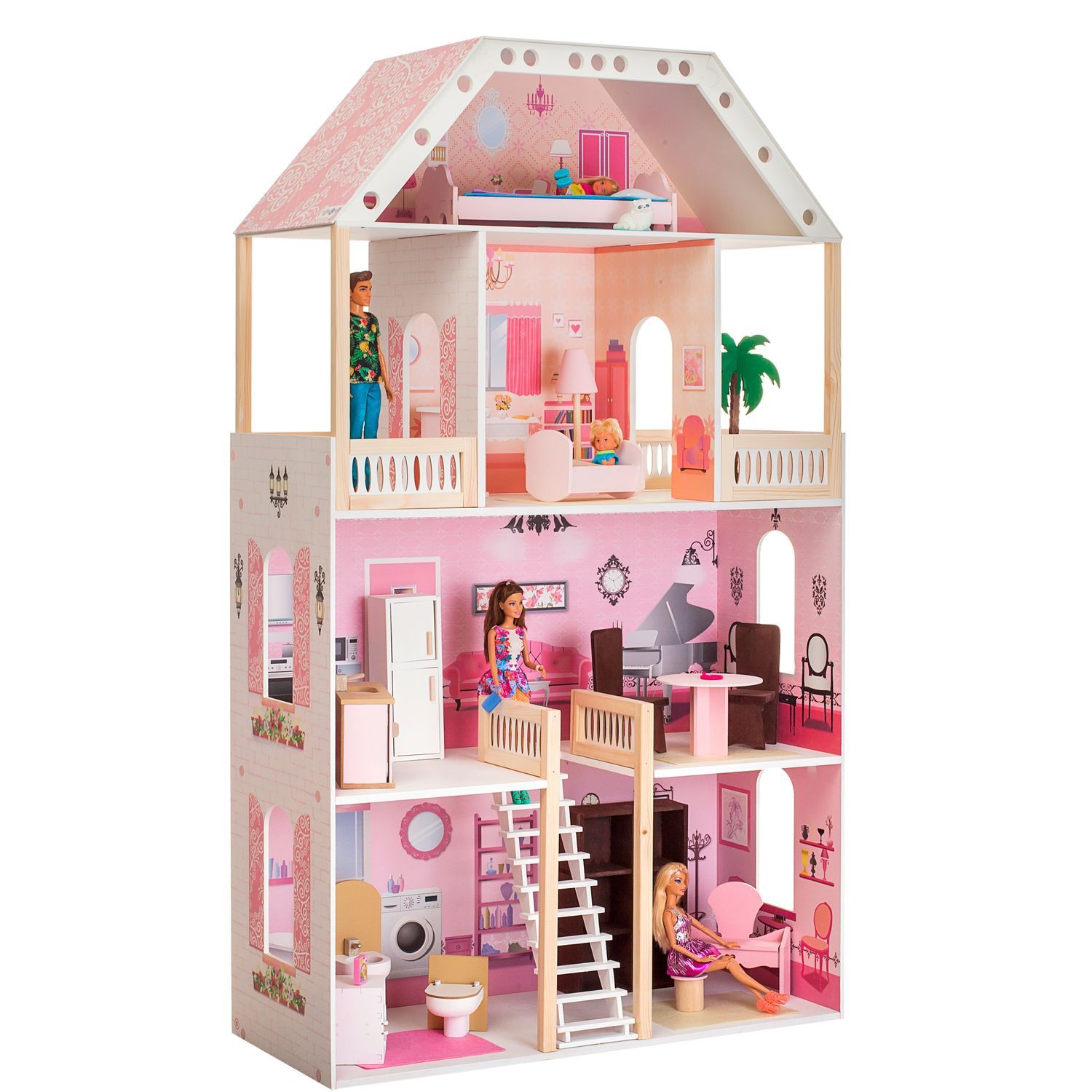 Домик подходит для кукол высотой в пределах 30 сантиметров. Состоит из четырёх этажей и пяти комнат. На уровне третьего этажа есть два балкона. Для сообщения между этажами предусмотрена лестница. Играя с кукольным домиком, дети смогут развивать мелкую моторику, воображение и координацию движений.
