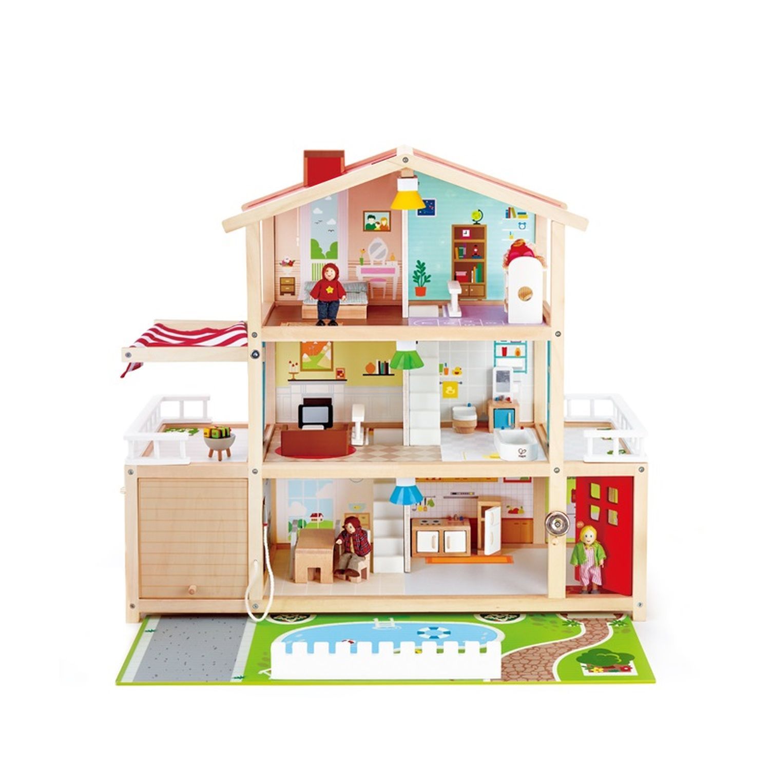 Кукольный домик оснащён интерактивными элементами: реалистичный звонок со звуковыми эффектами и три светодиодных люстры на каждом этаже.