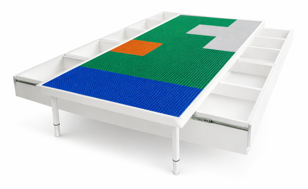 Мебель с LEGO-пластинами стоит на 4-х телескопических ножках. Развивающий стол подходит для наборов серии Duplo, City, Friends, Creators, а также других конструкторов. Детали хранятся в 10-ти выдвижных ящиках под разноцветными полотнами с рельефной поверхностью.