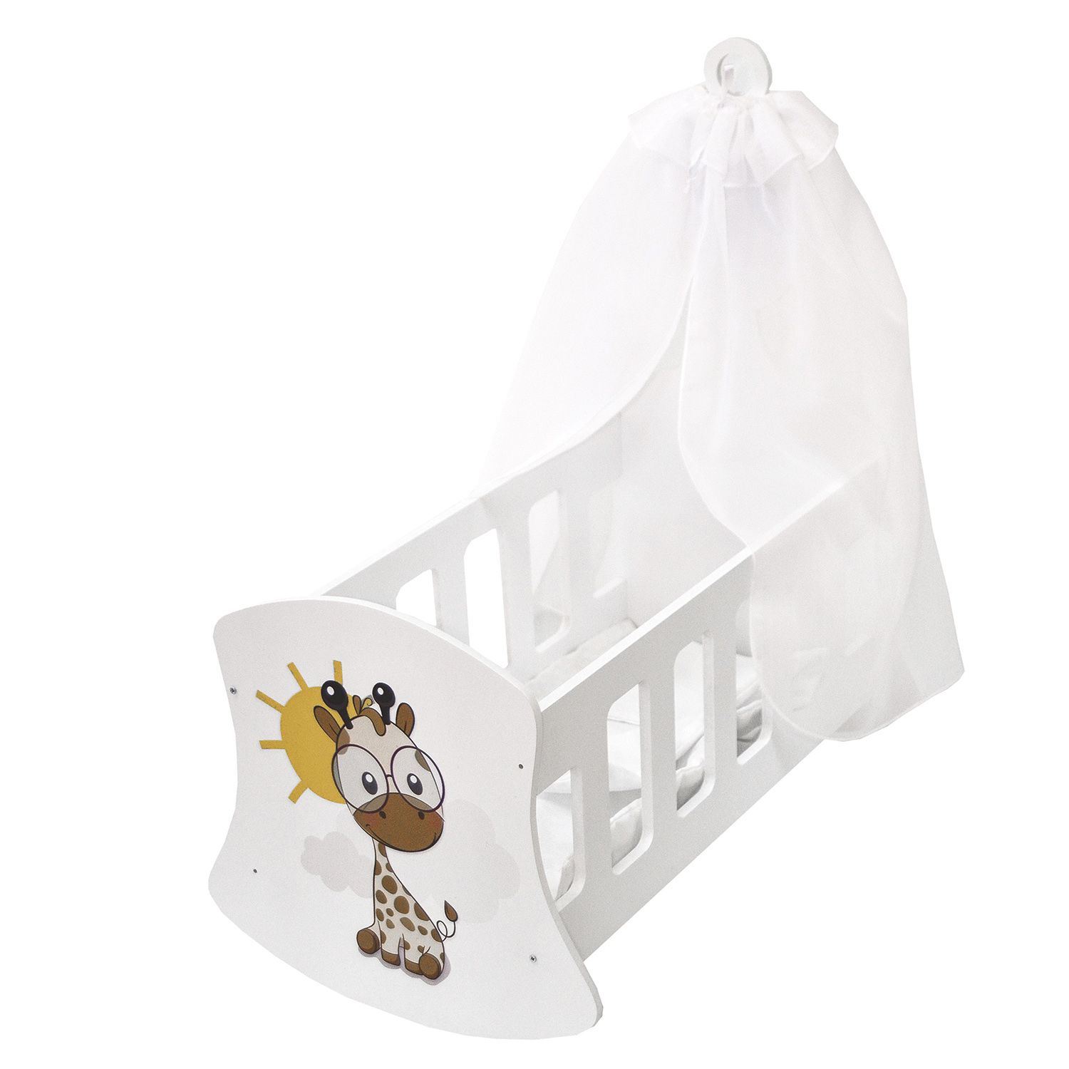 Люлька подходит для игр с куклами высотой до 30 сантиметров. Поставляется в разобранном виде с инструкцией по сборке. В комплект также входят балдахин и однотонное постельное бельё: матрас, подушка и одеяло. Бортик люльки декорирован полноцветным рисунком.