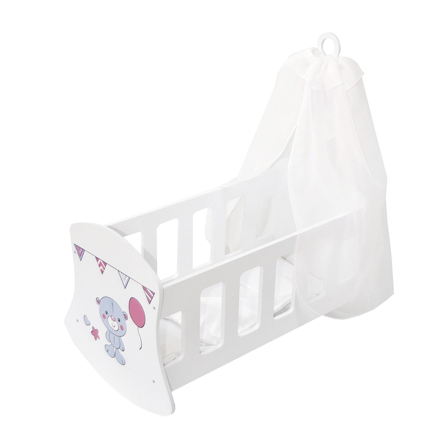 Кроватка подойдёт для кукол высотой до 30 сантиметров. Поставляется в разобранном виде с инструкцией по сборке. В комплект входят балдахин и однотонное постельное бельё: матрас, подушка и одеяло. Корпус люльки декорирован полноцветным рисунком.