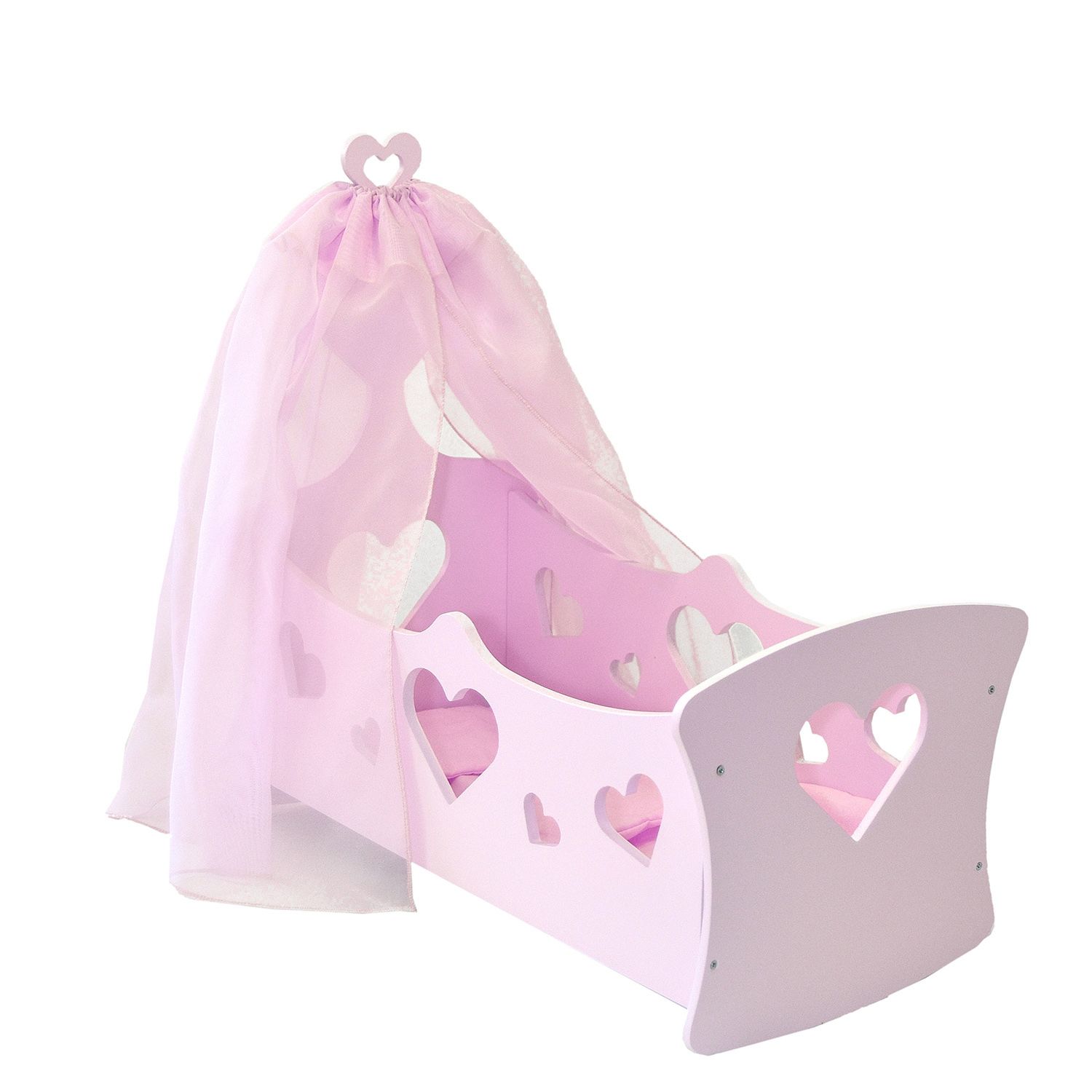 Игрушка поставляется в разобранном виде с инструкцией по сборке. Также в комплект входят балдахин и постельное бельё: подушка, одеяло, матрас. Люлька декорирована фигурными вырубками в форме сердца. Кроватка подходит для игр с куклами высотой от 25 до 45 сантиметров.