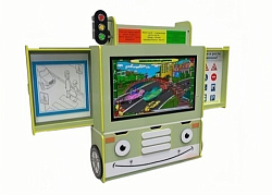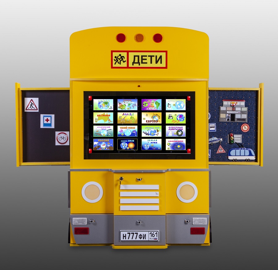 Выполнен в форме кабины автобуса, является сенсорным модулем. Сконструирован с учетом предполагаемых показателей роста пользователей: дошкольников и младших школьников.