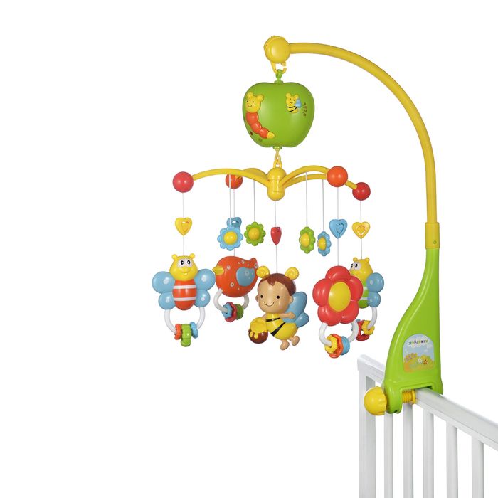 Устройство с заводным механизмом при помощи винта фиксируется над кроваткой ребенка. На подвесах закреплены разноцветные элементы со звуковыми эффектами и безопасным фигурным переключателем. Доступно 18 аудиодорожек. Игрушки оснащаются петельками, которые служат для стимуляции хватательного рефлекса. Мобиль способствует развитию слухового восприятия, зрительной и музыкальной памяти, цветоразличения.