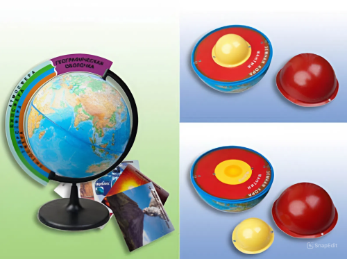 Внутренняя поверхность полусферы "Северное полушарие" обозначает земную кору и также согласована по цвету с диском. Состав компонентов географической оболочки Земли (в принятой последовательности "Литосфера", "Гидросфера", "Биосфера" и "Атмосфера") представлен дугой, фиксирующейся в щелевых пазах на дуге "Меридиан".