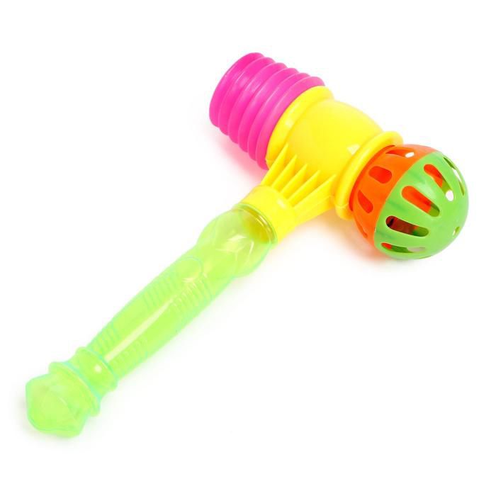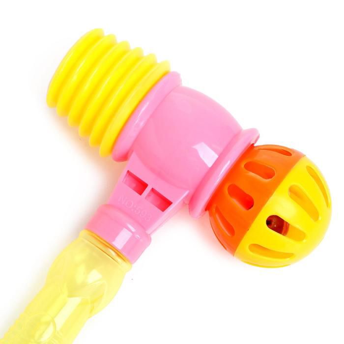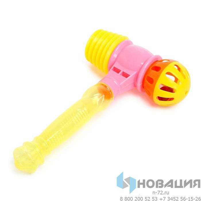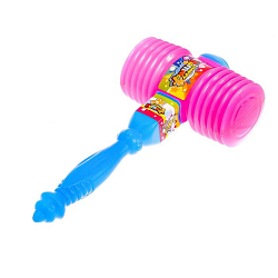 Разноцветный детский молоток оснащен твердой ручкой, мягким оголовьем и погремушкой. Модель инструмента звенит и пищит при ударе. Игрушка помогает развить скорость реакции, точность движений, усовершенствовать глазомер.