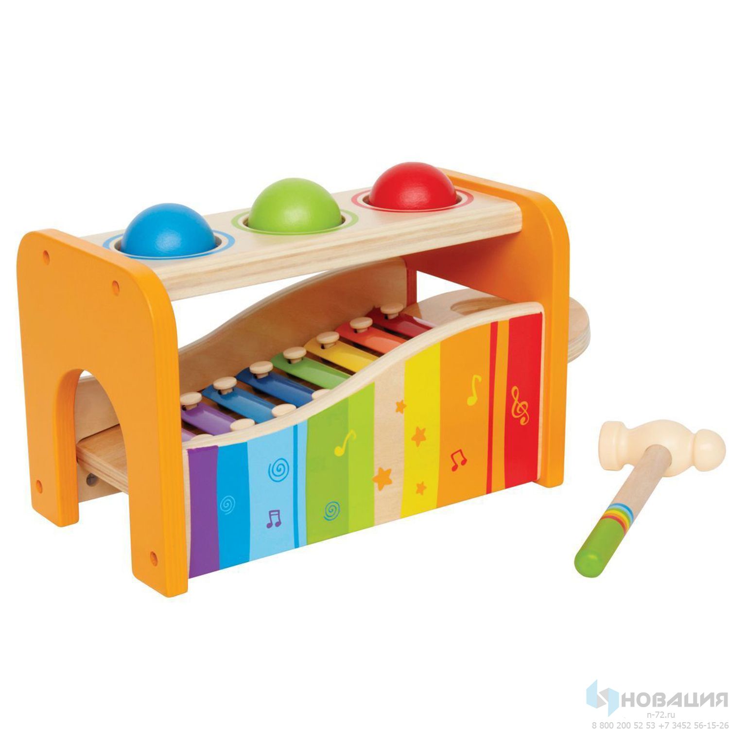 Двухуровневая игрушка состоит из ксилофона на первом ярусе и трёх шариков на втором. Чтобы шарики издавали звуки, по ним нужно стучать деревянным молоточком (входит в набор). Игрушка оказывает положительное влияние на развитие координации, слуха, моторики рук.
