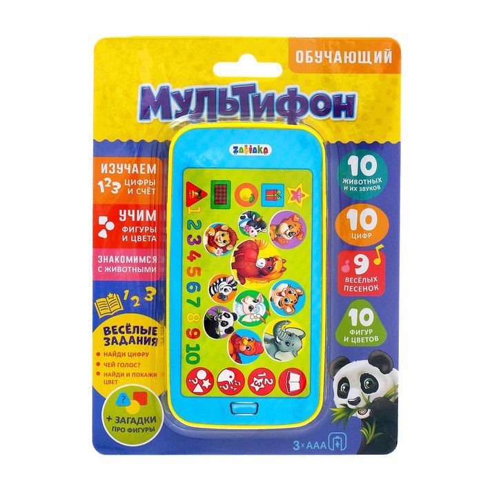 Игрушка в виде смартфона работает от 3-х батареек типа ААА. Запрограммировано 9 песенок для детей, настроена функция загадок и вопросов. Ребенок будет находить цифры, изучать фигуры, угадывать животных по звукам.