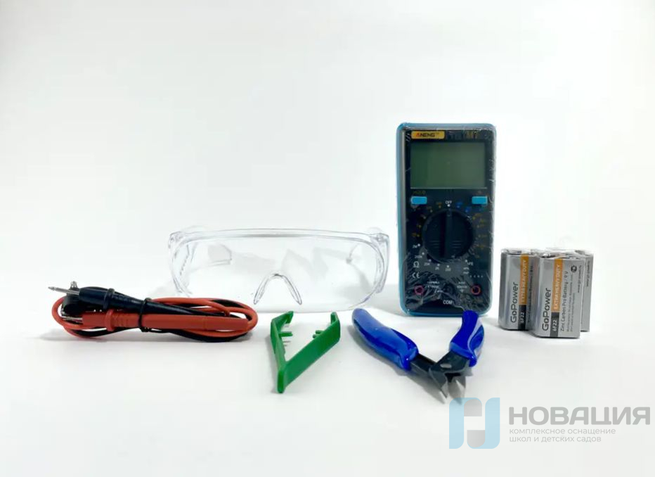 - Набор аксессуаров и инструментов для работы (мультиметр с двумя видами щупов, комплект перемычек, бокорезы, пинцет, защитные очки, и пр.);