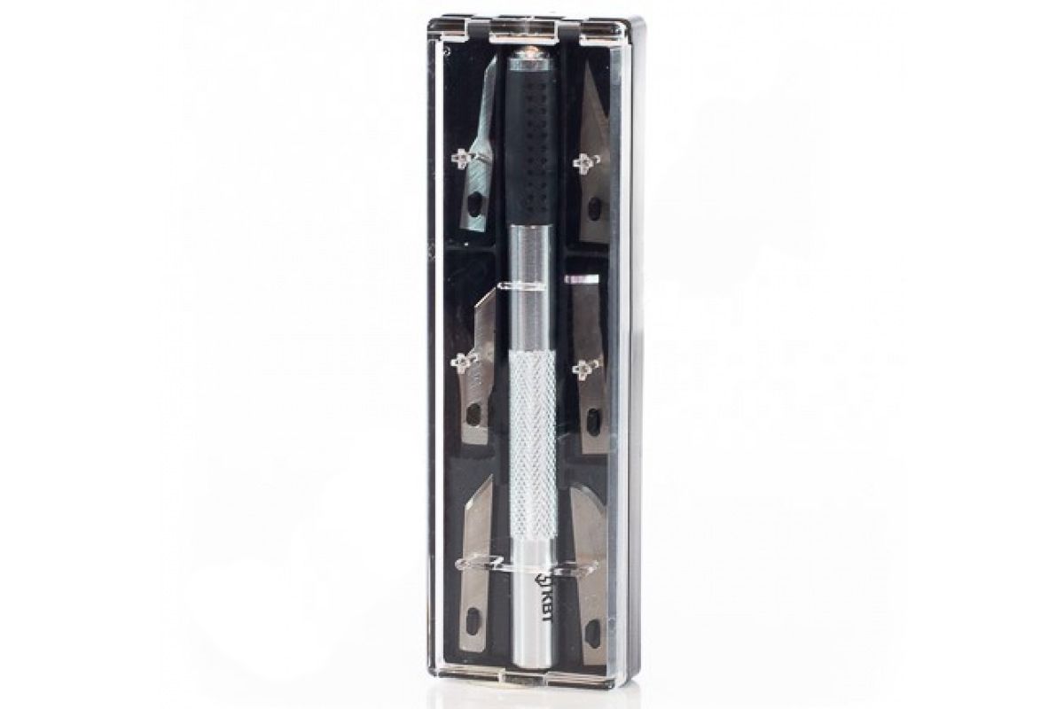 Комплект ножей с 1 металлической рукояткой и 6-ю сменными лезвиями в форме пера подходит для нарезания мягких материалов: кожи, резины, ткани, картона.