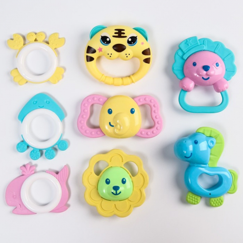 Изделия из мягкого и твердого пластика красочно оформлены, имеют прорези для рук. Погремушки стимулируют слуховое развитие и помогают выработать хватательный рефлекс, а детали-прорезыватели помогут ребенку справиться с болью перед появлением зубов. Взаимодействие с набором влияет на моторику рук и формирует правильный прикус.