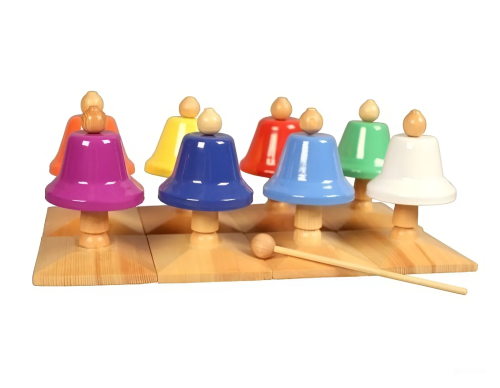 Инструмент состоит из восьми ярких колокольчиков, каждый из которых настроен на определенную ноту "до"(С) "ре"(D) "ми"(E) "фа"(F) "соль"(G) "ля"(A) "си"(B) "до"(C') и издает чистый, блестящий звук, который радует ясным и звонким тембром.
