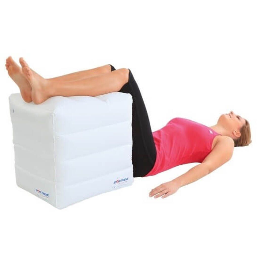 Кубик для приподнимания ног представлен разновысокими ребрами, благодаря чему есть 3 варианта высоты опоры. Изделие помогает расслабить мышцы спины, наладить кровообращение. Снижается давление на межпозвоночные диски. Надувной кубик не используется в качестве сиденья, хранится в сложенном состоянии.