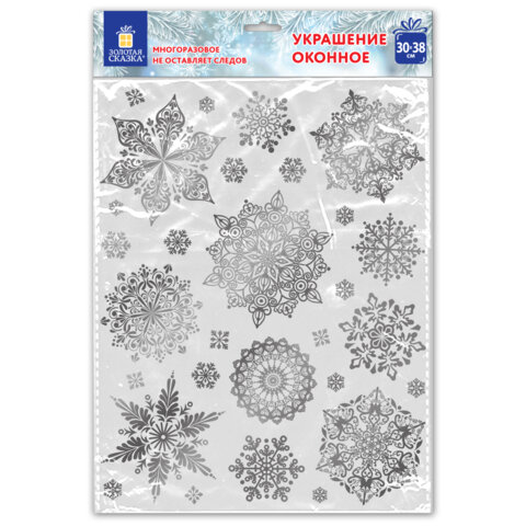 Наклейка для окон двусторонняя МНОГОРАЗОВАЯ 30*38см "Снежинки" фольга, серебро ЗОЛОТАЯ СКАЗКА 591928