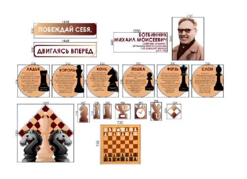 - стенд с информацией о ферзе и изображением фигуры, размеры (ДхШ) - 730х730 мм - 1 шт.;