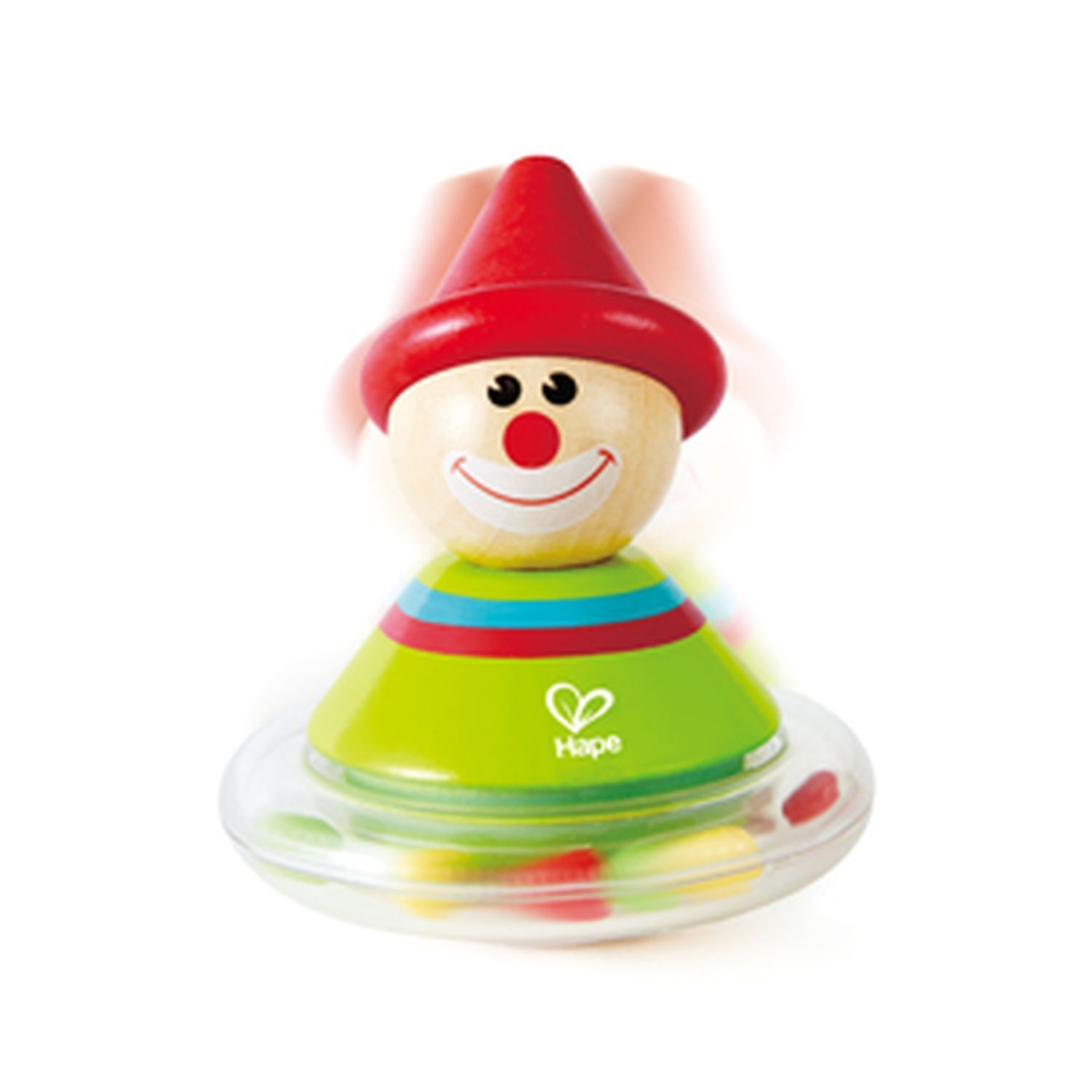 Деревянный корпус в виде клоуна встроен в пластиковое основание с бусинками внутри. В конструкции игрушки отсутствуют мелкие детали и острые углы.