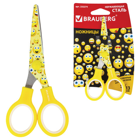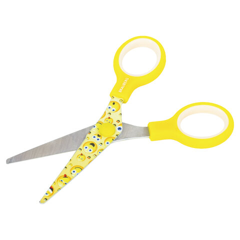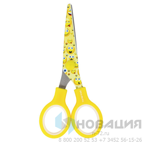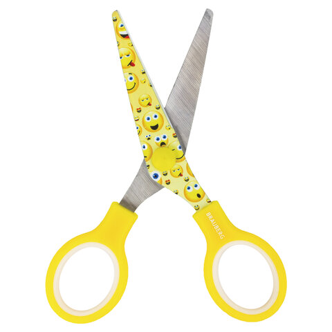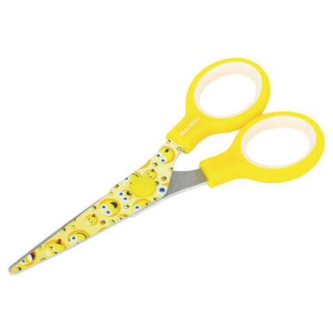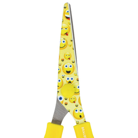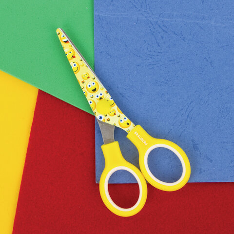 Ножницы BRAUBERG "Kid Series", 130 мм жёлто-белые с цветной печатью "Смайлики", закругленные, 232274