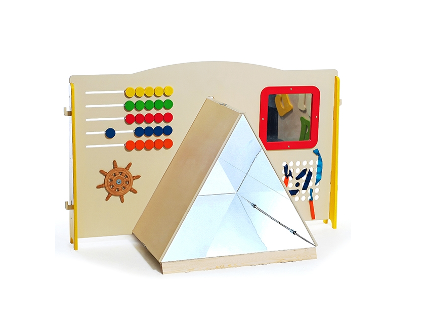По центру находится треугольный элемент с зеркальной пленкой на лицевой грани. Ребенок рассматривает отражение предметов, получает первое представление об оптике. При необходимости треугольник поставляется без пленки.