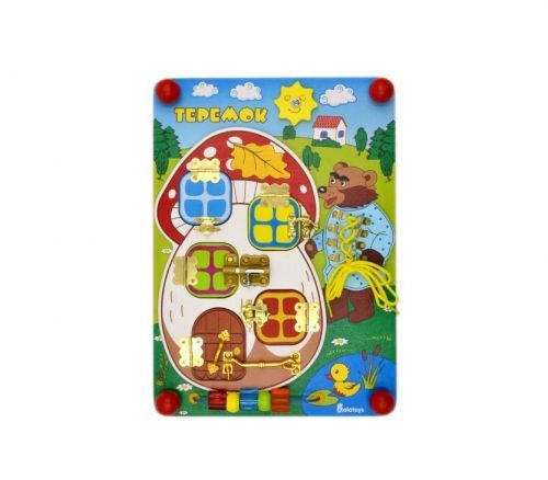 "Теремок" представляет собой панель с несколькими дверцами и замочками разной конфигурации. Игра с панелью развивает мелкую моторику, логику, усидчивость.